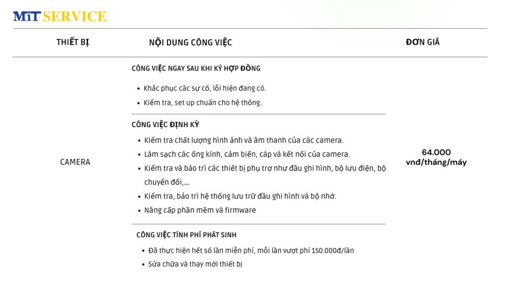 Bảng giá gói bảo dưỡng camera của MiT